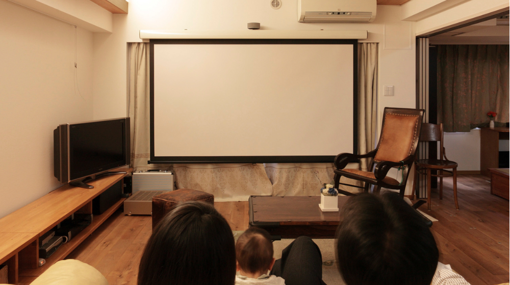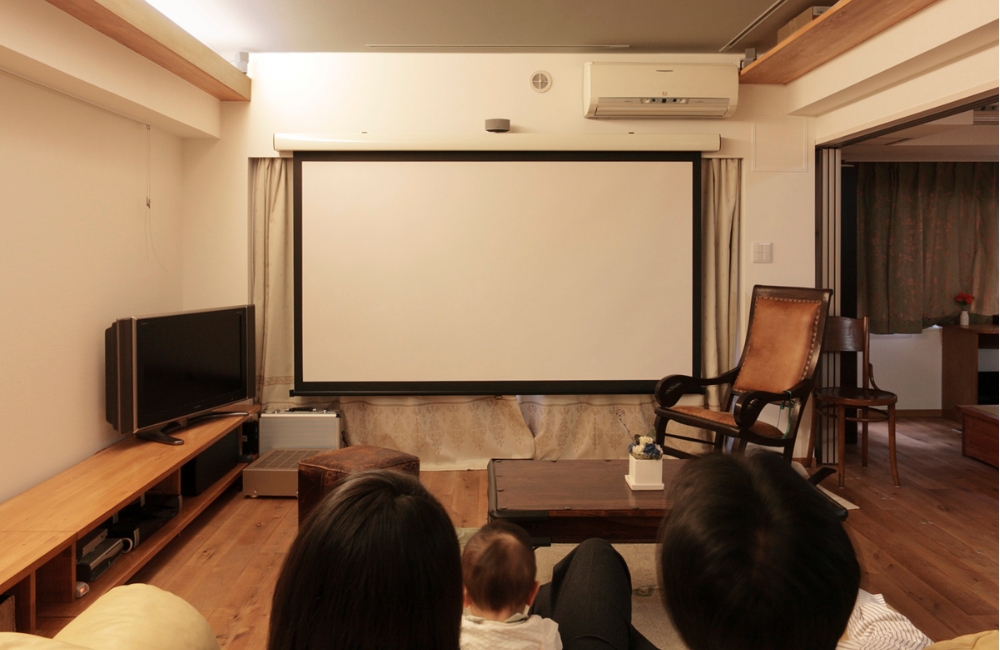 掃き出し窓の上部に、収納式のスクリーンを設置。大画面、高音質のスピーカーで見る映画は大迫力。小さなお子様がいても、お家なら安心して映画が見れますね。家族のコミュニケーションの場にもなります。
