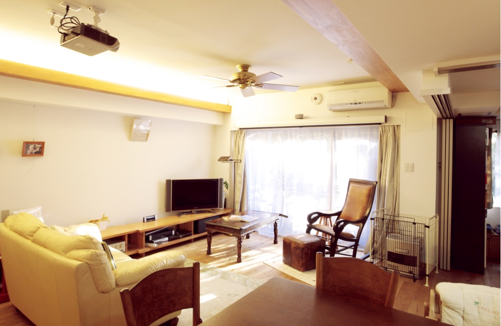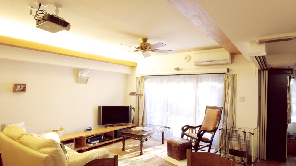 ▷ 天井にプロジェクターを設置。「CD管(配線を通す管)」が天井裏に埋め込まれています。リフォーム時にプロジェクターを設置しておけば配線が隠れてすっきり。