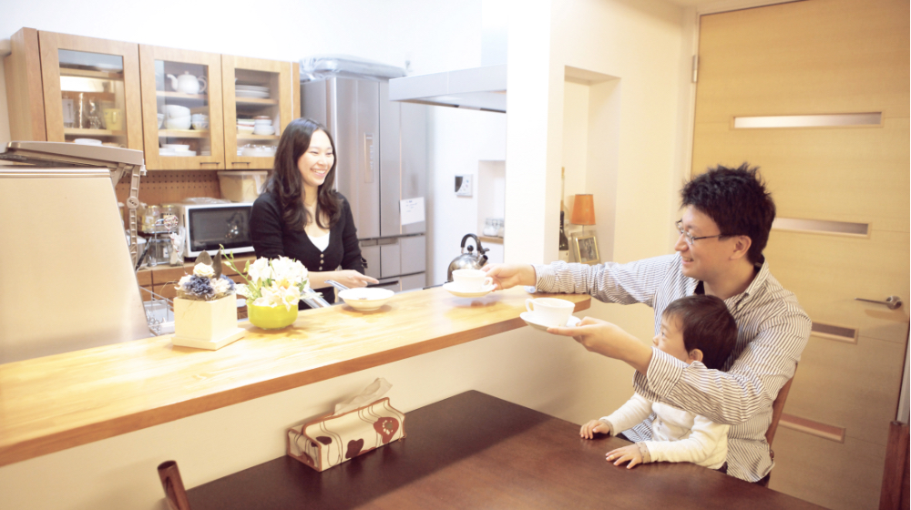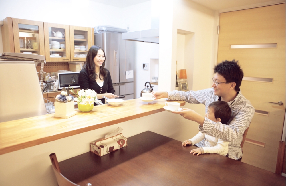 目がはなせない小さなお子様のいるご家庭。対面キッチンなので、料理していてもリビング全体が見渡せ、いつもお子様の気配を感じとりながら家事ができる設計に。