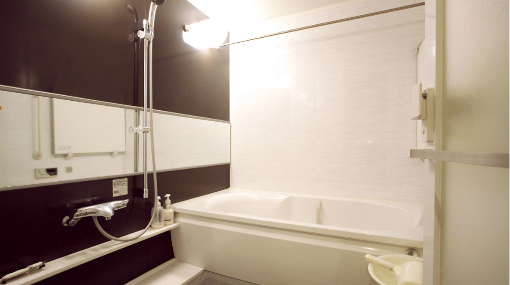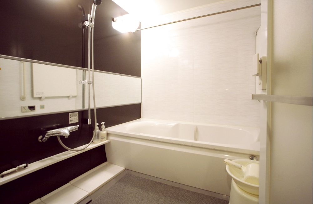 シャワーをかけるスライドバーは手すり兼用のモノを採用。写真ではわかりませんが、逆サイドの壁面にも手すりを付けました。抱っこしながら入る時、小さい子供が自分で入る時も手すりがあると安全です。