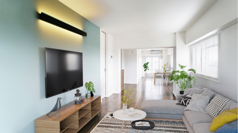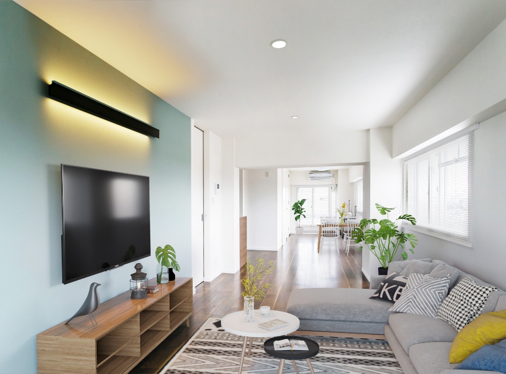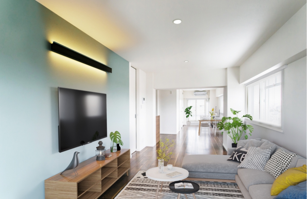 リビングの壁⾯の⼀部をブルーグレーにすることで広い空間を緩やかにゾーニング。ブルーグレーの壁面と間接照明により、空間にアクセントを付加。平凡になりすぎない、さりげないデザイン演出を施しました。