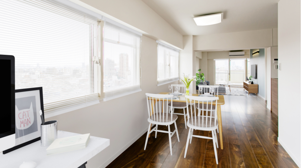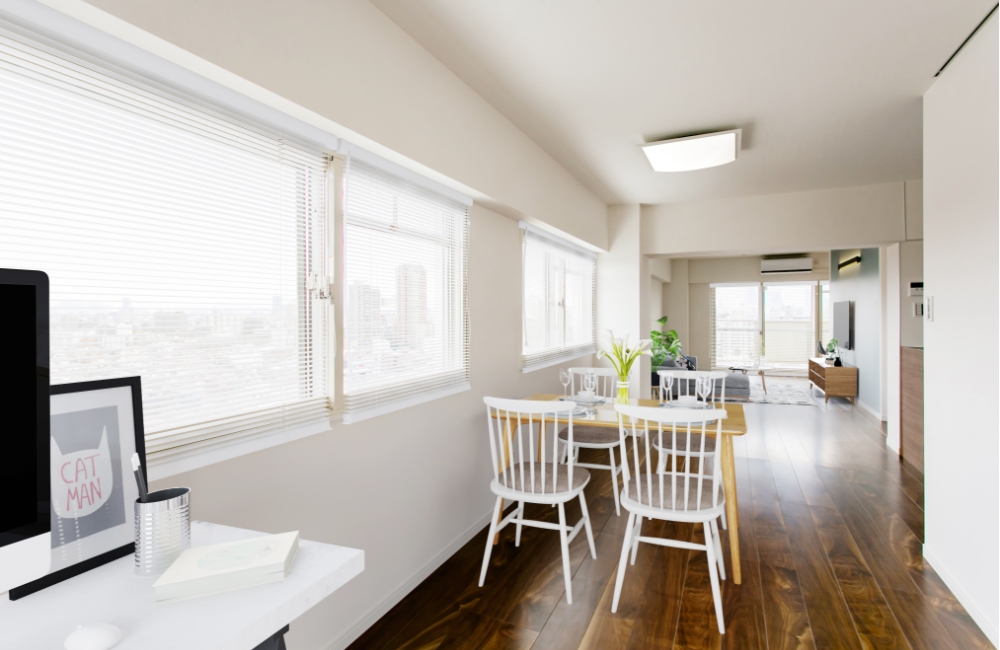 個別に区切られ薄暗い印象だった部屋をひとつの⼤空間にし、窓からの採光を最⼤限に取り⼊れられるように変更。薄暗い印象だった住空間が、光の差し込む開放的な住空間になりました。
