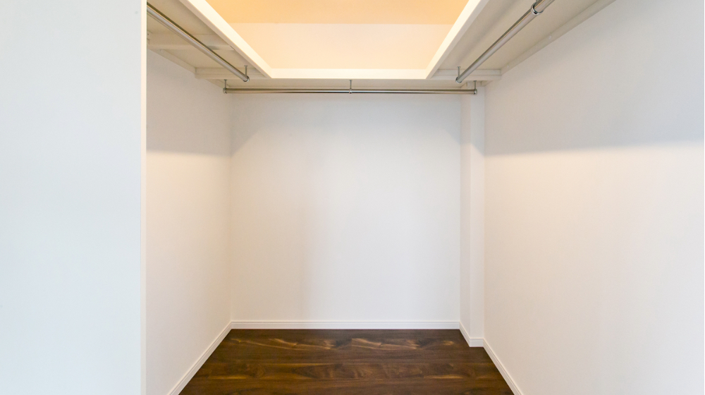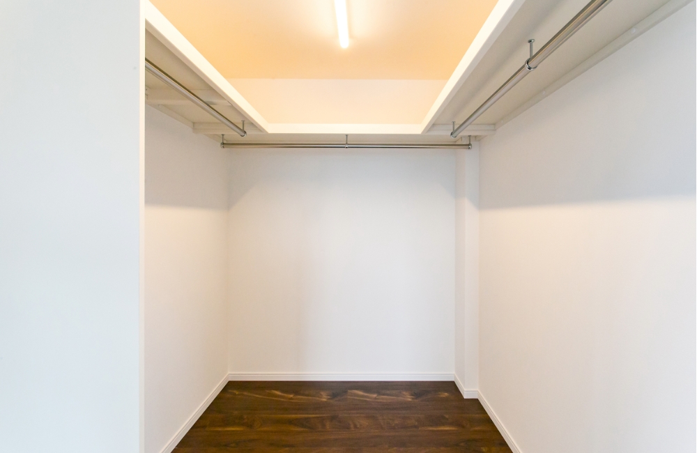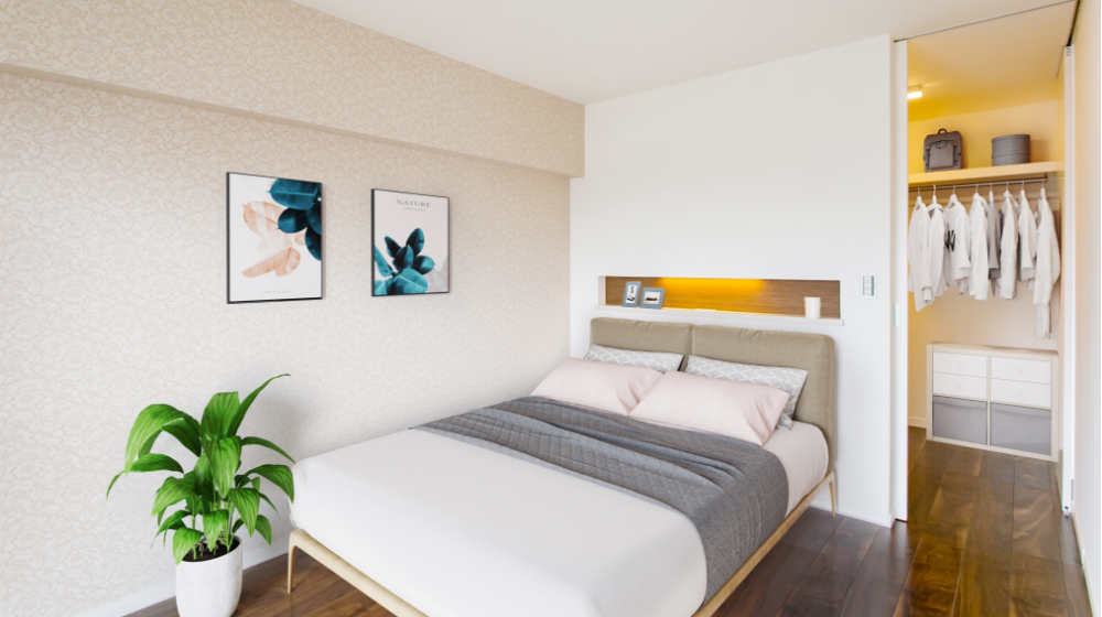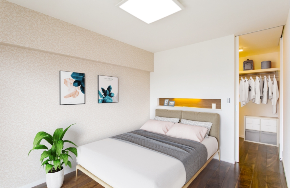 ベッドルームは頭側に眼鏡や本を置けるようニッチを設け、スマホの充電ができるようにコンセントを配置。ニッチ内には照明を付け、夜中⽬覚めたときにちょっとした明かりを確保できるように配慮。ベッドルーム奥には、リビング側からも入れる大容量のウォークインクローゼットを設置しています。