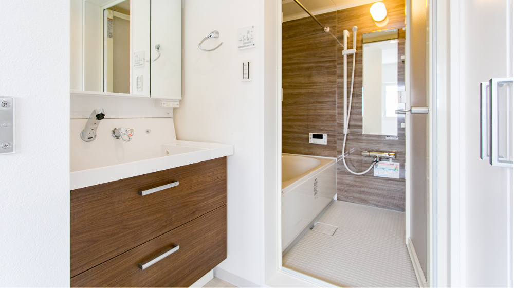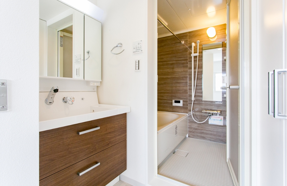 水回りを床⾯と同じテイストの⽊⽬調で統⼀