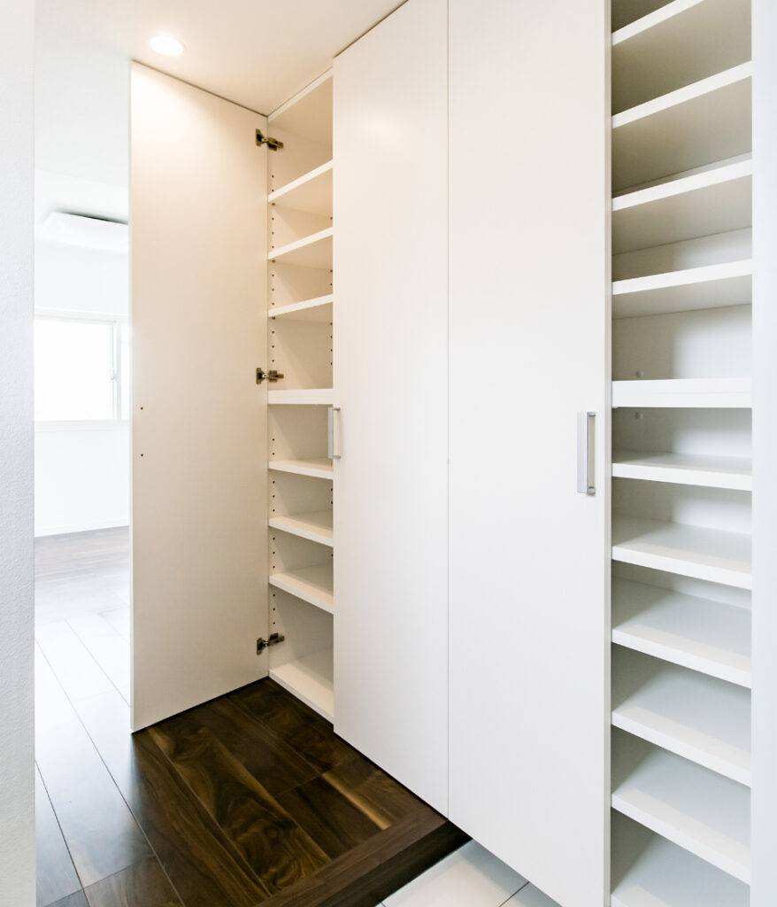 ⽞関収納は、しまうモノに合わせて⾼さを変えられる可動棚
