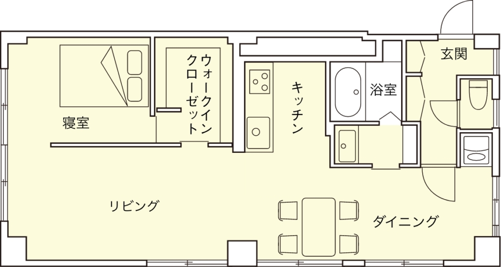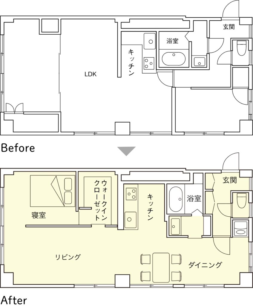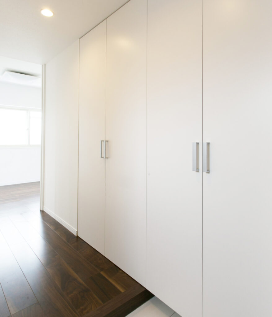 3部屋に区切られた薄暗い印象の空間が、壁を取り払うことで、明るく広々とした大空間へと生まれ変わりました。化粧台、バスルーム周りの無駄な動線を無くし、玄関収納をたっぷり確保。また、寝室、リビング両方からアプローチできるウォークスルークローゼットを造り、機能性も兼ね備えました。