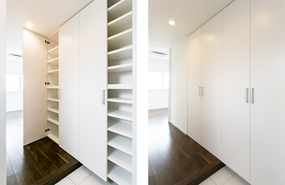 ▷ 玄関収納は、しまうモノに合わせて高さを変えられる可動棚。