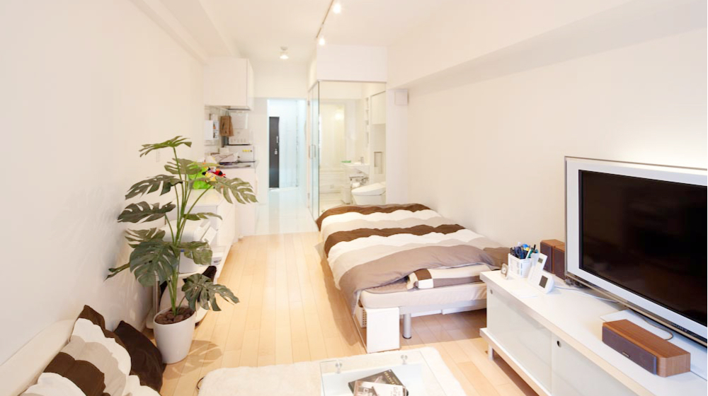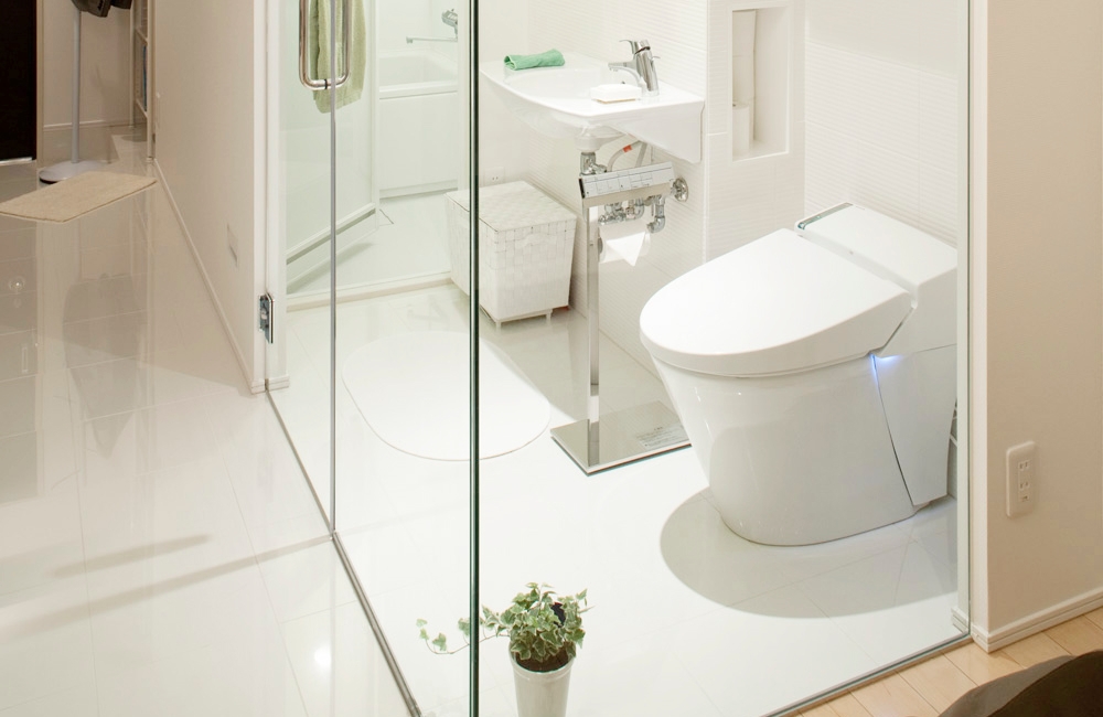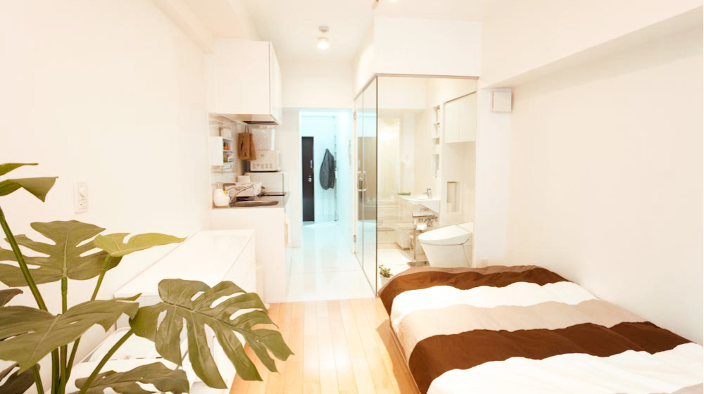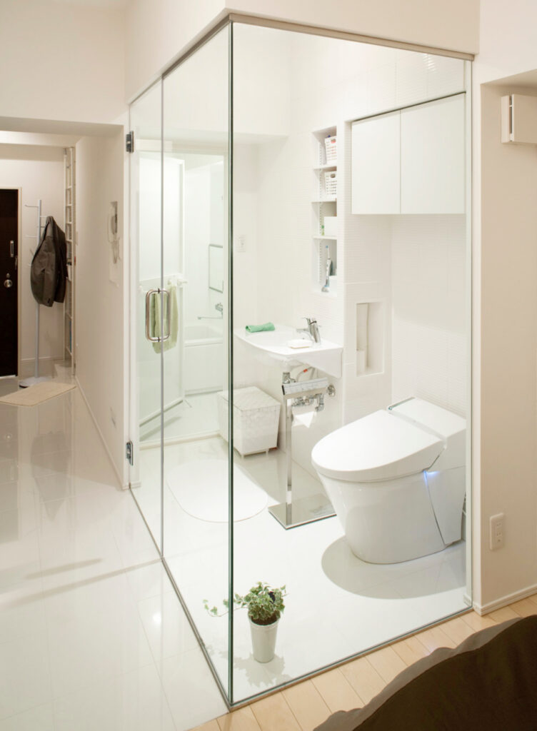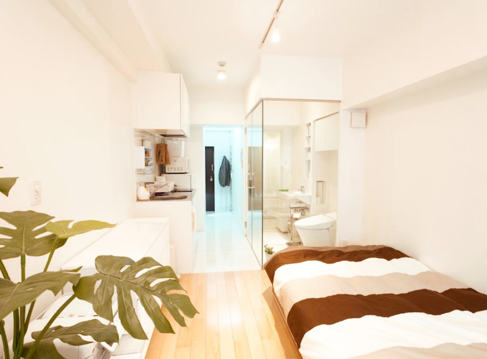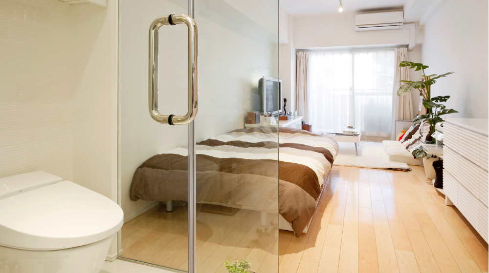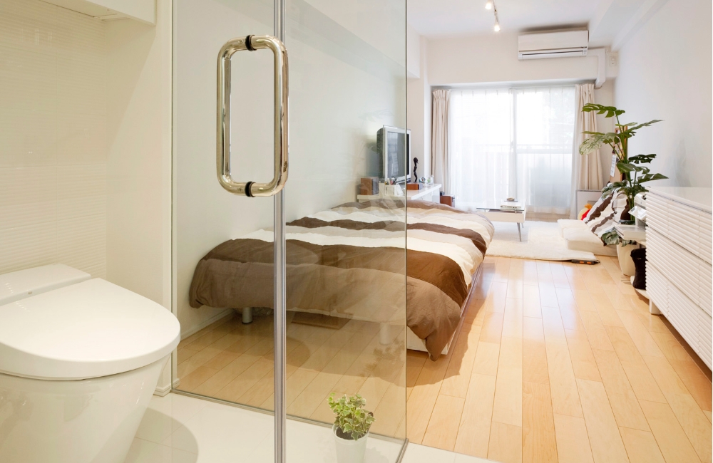 天井高を上げ、壁も出来るだけ薄くし、空間を可能な限り拡大したことで、ワンルーム空間がひとまわり大きくなりました。さらに、水回りをガラス張りにしたことで、開放的な住空間に。