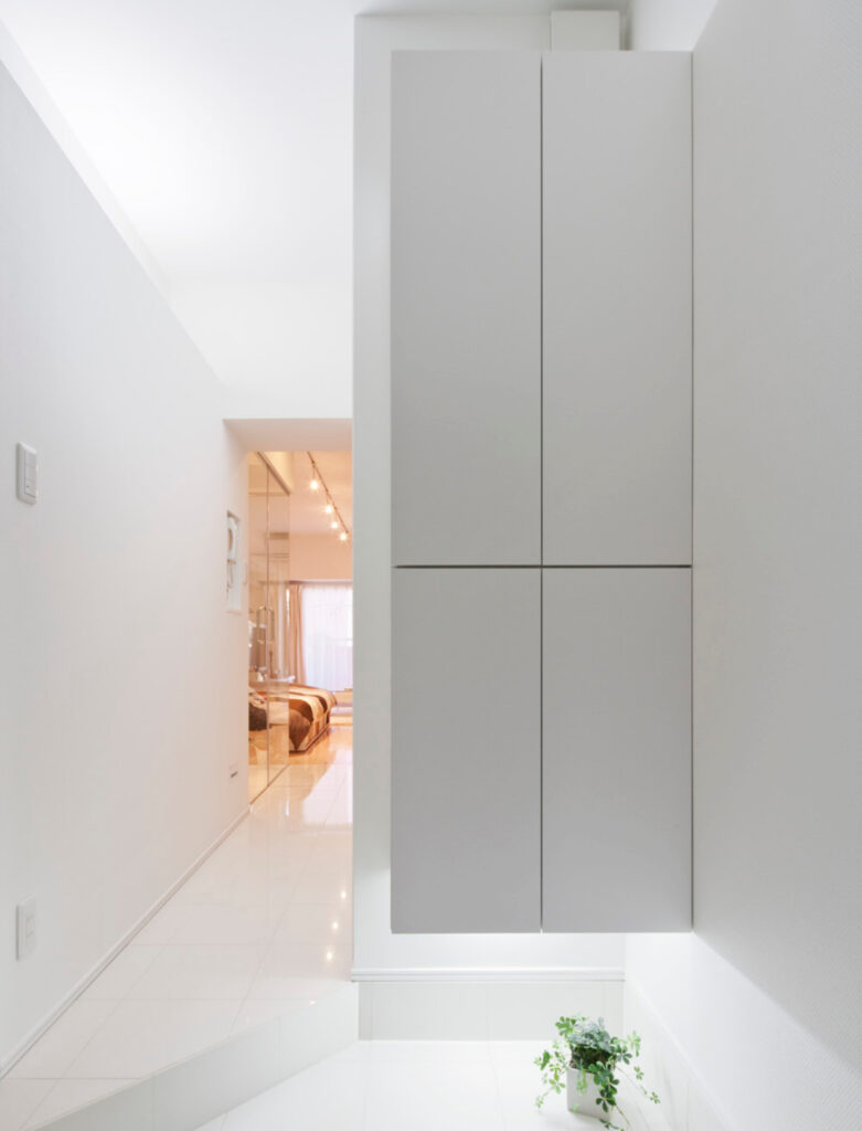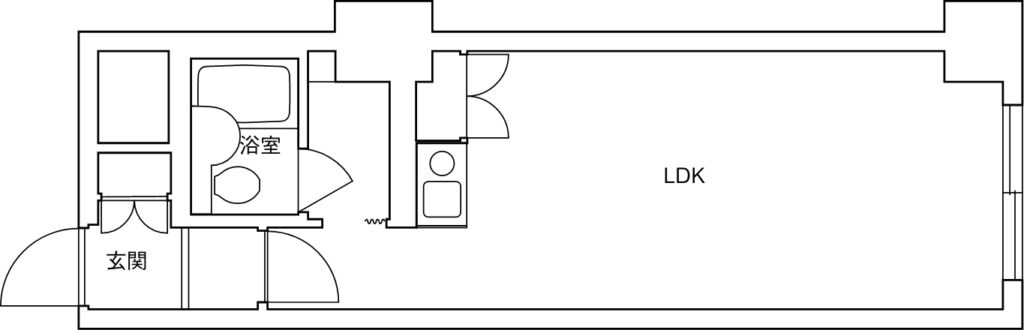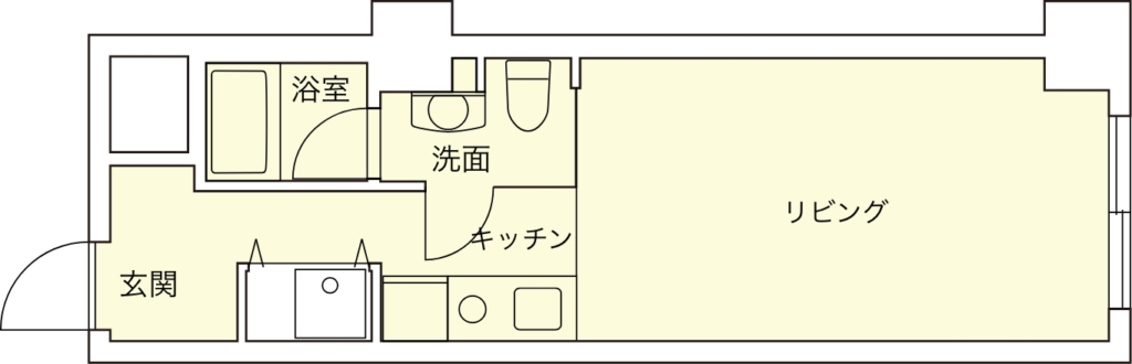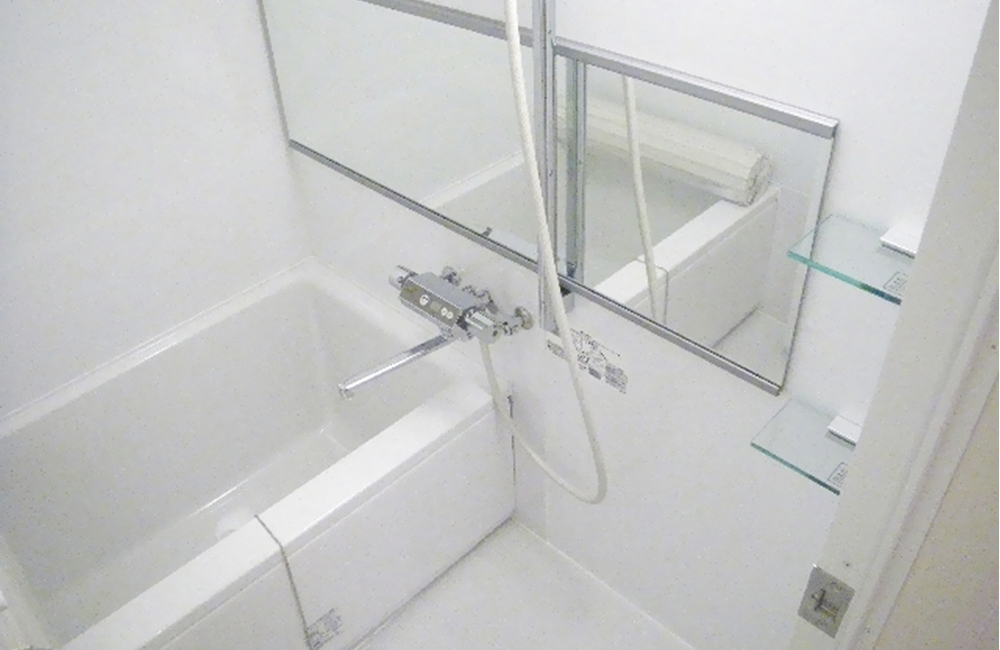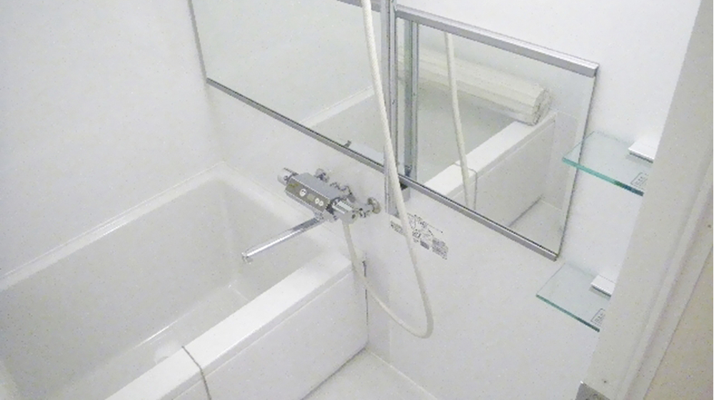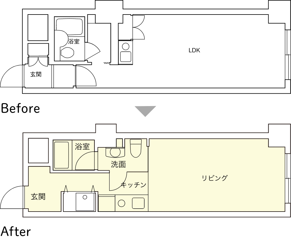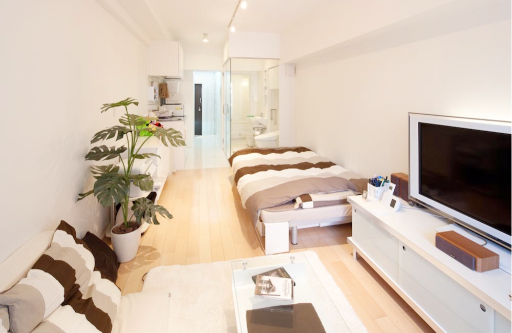 天井高を上げ、壁も出来るだけ薄くし、空間を可能な限り拡大したことで、ワンルーム空間がひとまわり大きくなりました。さらに、水回りをガラス張りにしたことで、開放的な住空間に。