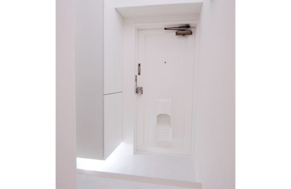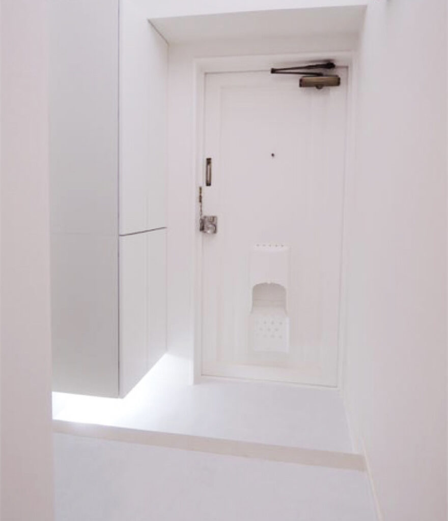 玄関は白で統一し、シューズボックスの下に間接照明を設置。清潔感のあるオシャレな空間に。