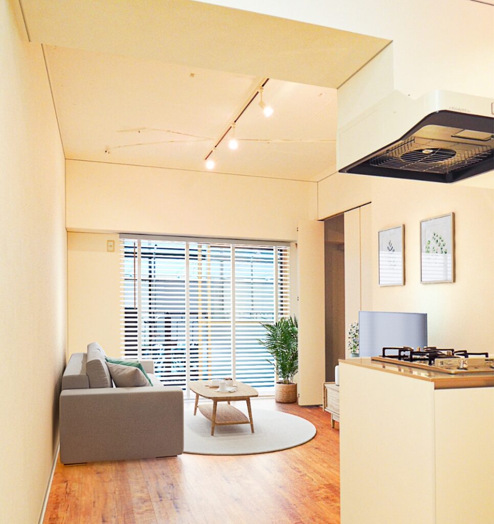 賃貸ワンルームマンションのリフォーム事例。マンション1階のお部屋で、リフォーム前は薄暗かったため、明るいお部屋になるよう⼼掛けました。床材は古⽊調のものを選ぶことでスタイリッシュな空間にしました。