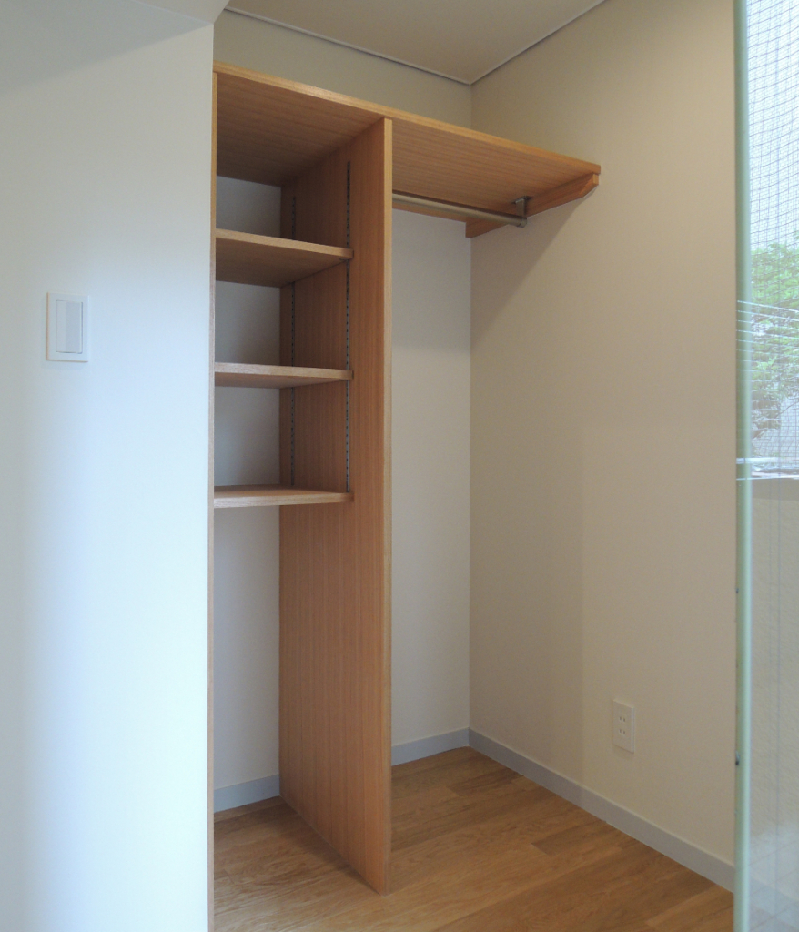 サッシ横の使いにくいスペースオープンなクローゼット。洗濯機収納の裏側には食器収納を造作。限られたスペースを有効活用して収納を確保しました。