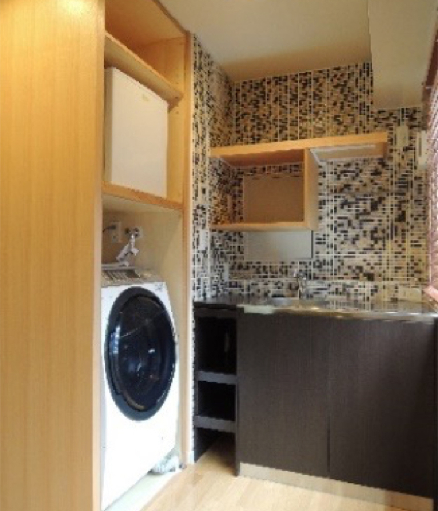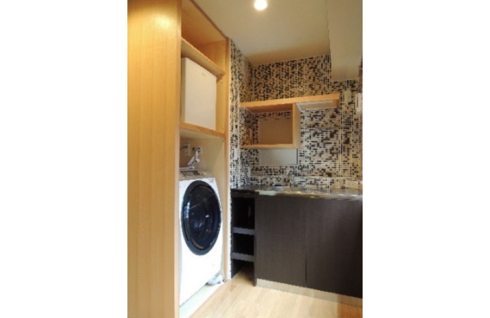 キッチンはモザイクタイルでオシャレな空間に。キッチンのサイドは洗濯機とミニ冷蔵庫のスペースになっています。滞在型ホテルのような考え方を採用。居室側からは雑多な物を見せない工夫です。