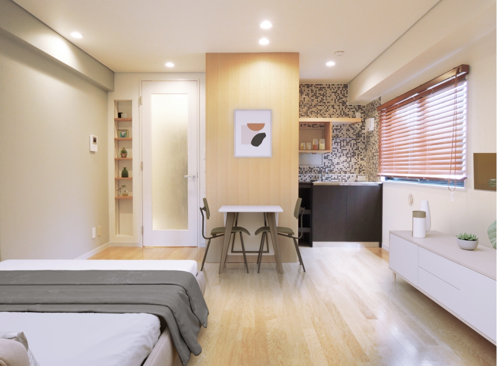 海外暮らしのオーナー様が日本に戻って来た時に使うワンルームマンション。滞在型ホテルのようなシンプルで使い勝手がよく、ちょっとおしゃれな空間に仕上げました。