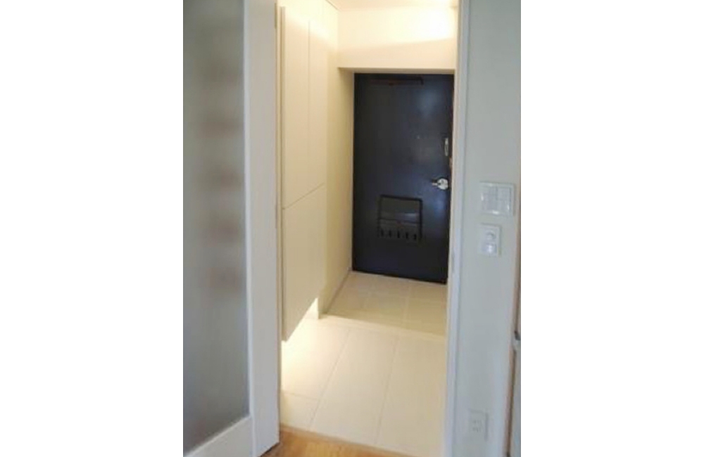 白いタイルを張ることで明るく広がりを感じさせる玄関に。土間と廊下に同じタイルを使用し繋がりを作ることで、より広く感じさせる効果を狙いました。