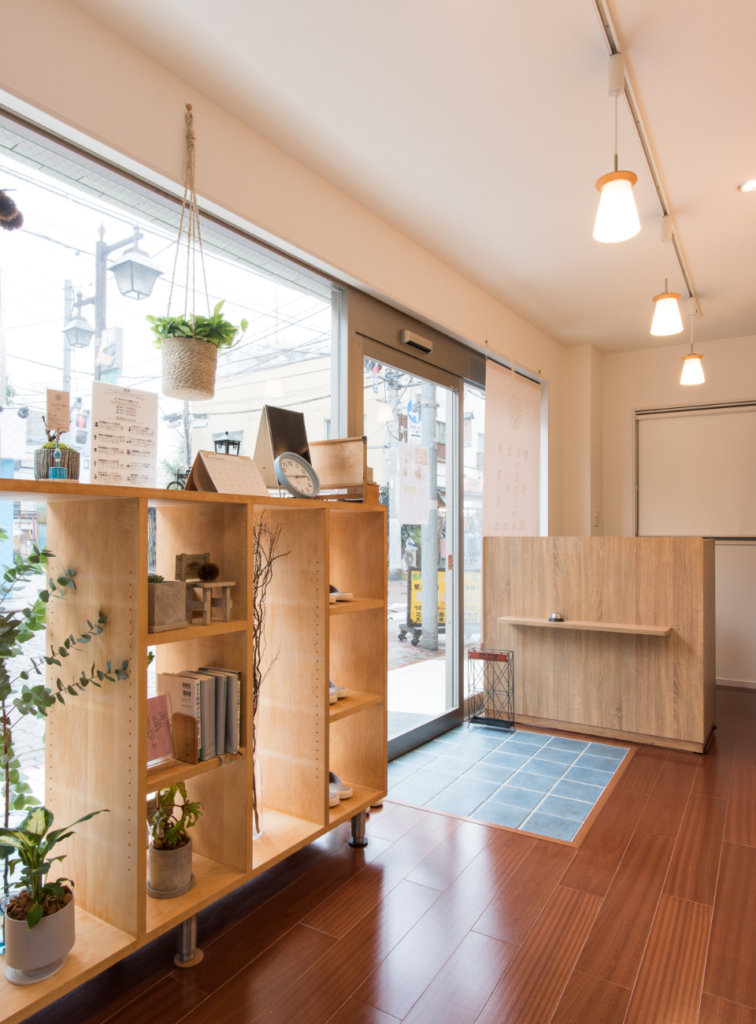 来店したお客様がリラックスして過ごせるよう、木のぬくもりと落ち着きのある空間に仕上げました。通りを歩く方にもお気軽に立ち寄っていただけるように、ガラス越しに見える店内の見え方も考えました。