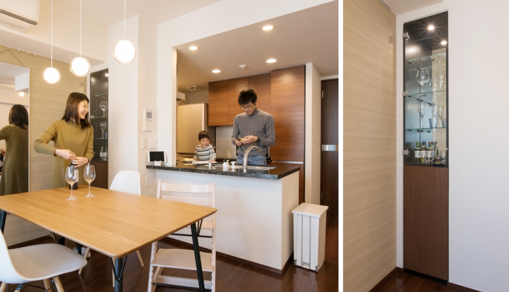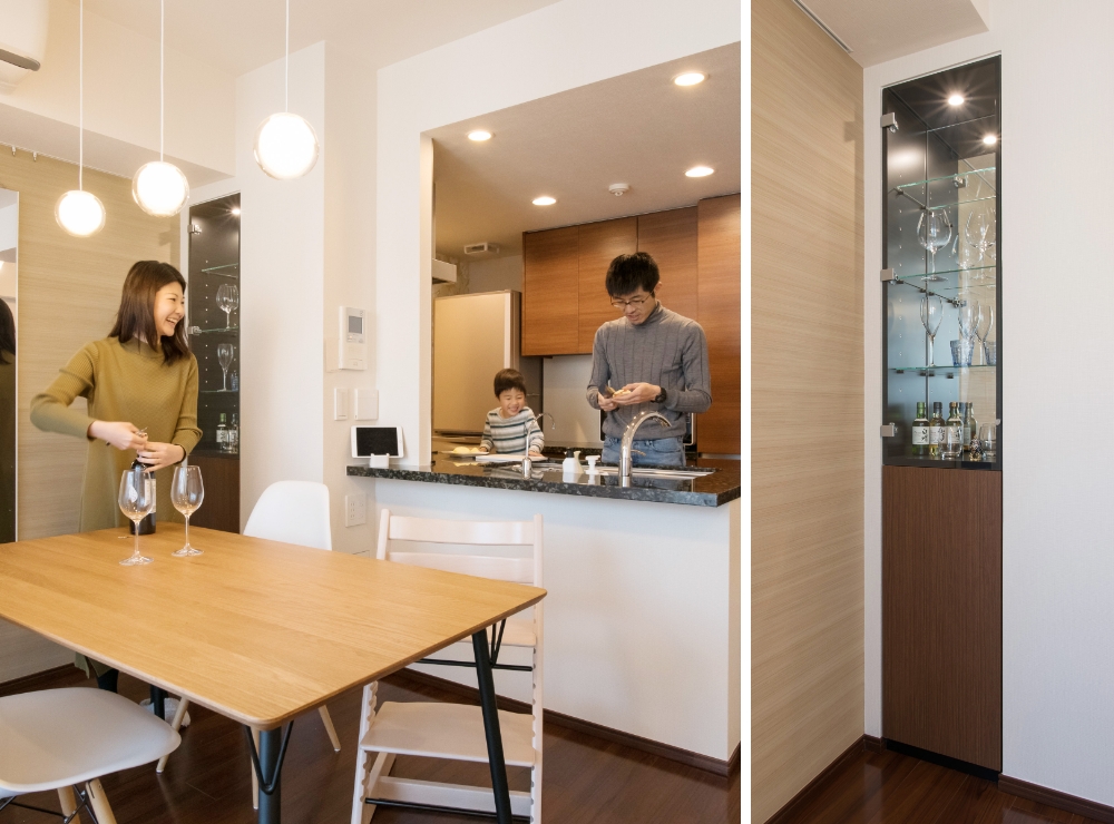 ワインがご趣味のご夫妻のために、ダイニング横の壁にはワイングラスが収納できるグラス棚を造作。場所をとらない壁埋め込み式収納になっています。