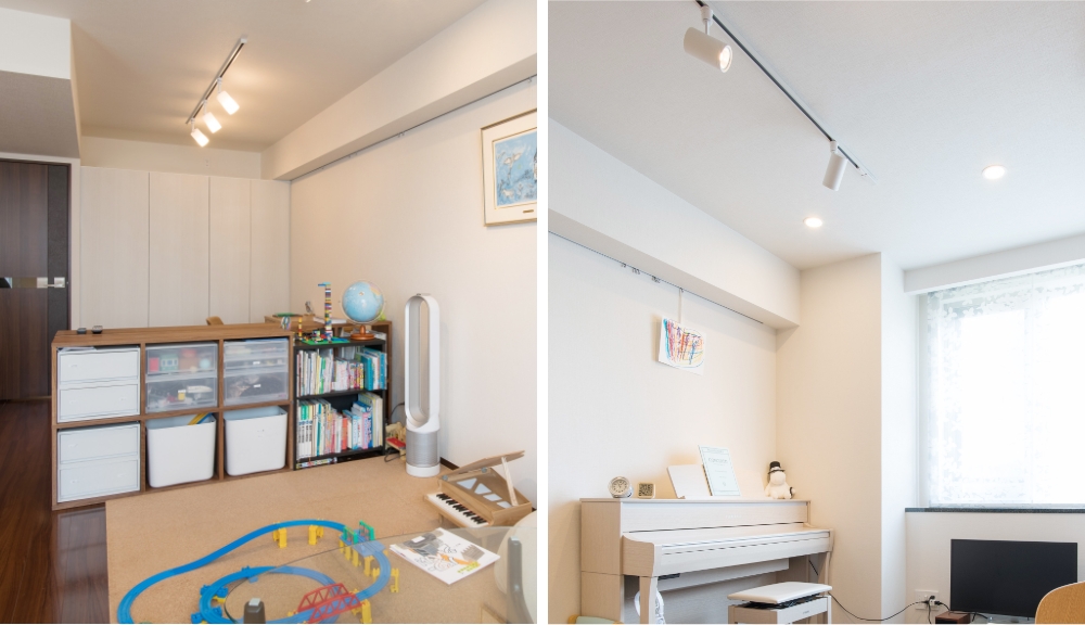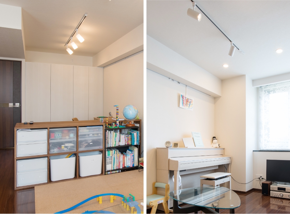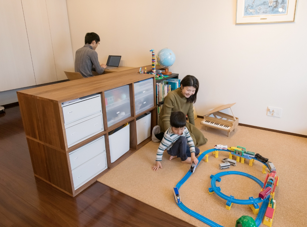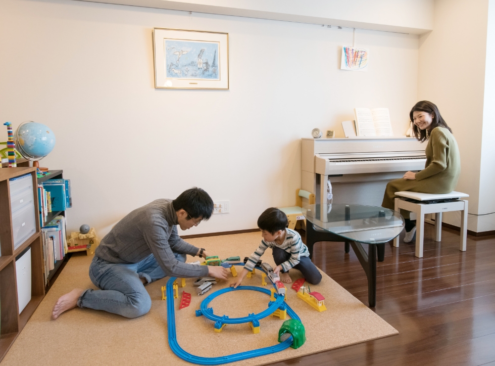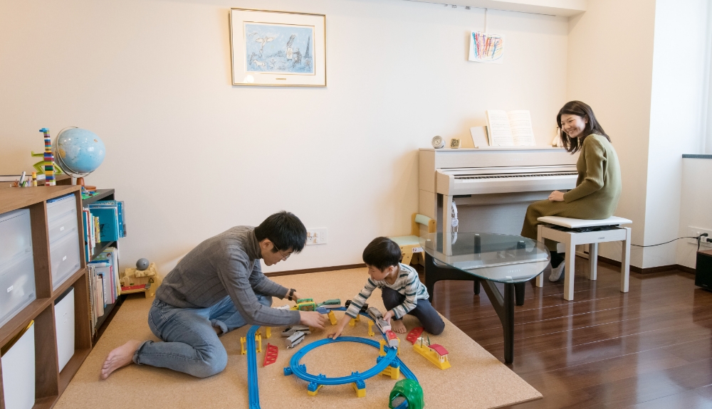 背の低いの家具やマットをうまく使って、リビングを3つのスペースにゆるやかにゾーニング。窓側は「奥様のピアノを楽しむスペース」、真ん中は「お子様の遊び場」、奥は「ご主人のワークスペース」。リビングを広く開放的な空間にしたいという要望と、空間を使いやすく仕切りたいという要望を同時に実現されました。