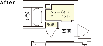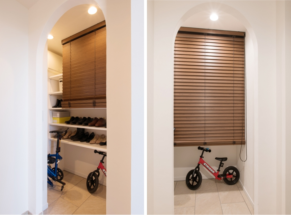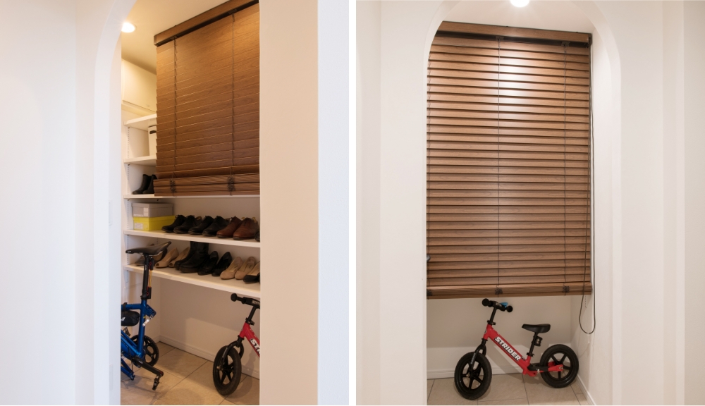 シューズインクローゼットは靴や傘だけではなく、自転車もしまえる広さ。部屋まで持ち込みたくないものはすべてここで保管することができます。ウッドブラインドを閉めれば見た目もスッキリ。