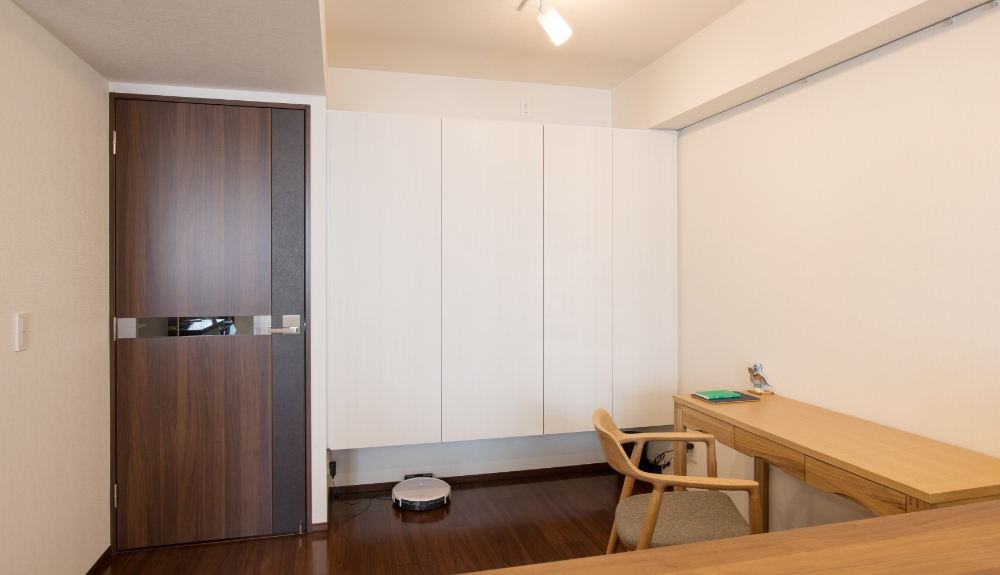 壁面収納は大容量。下部に空間を空けることで圧迫感を感じない設計。