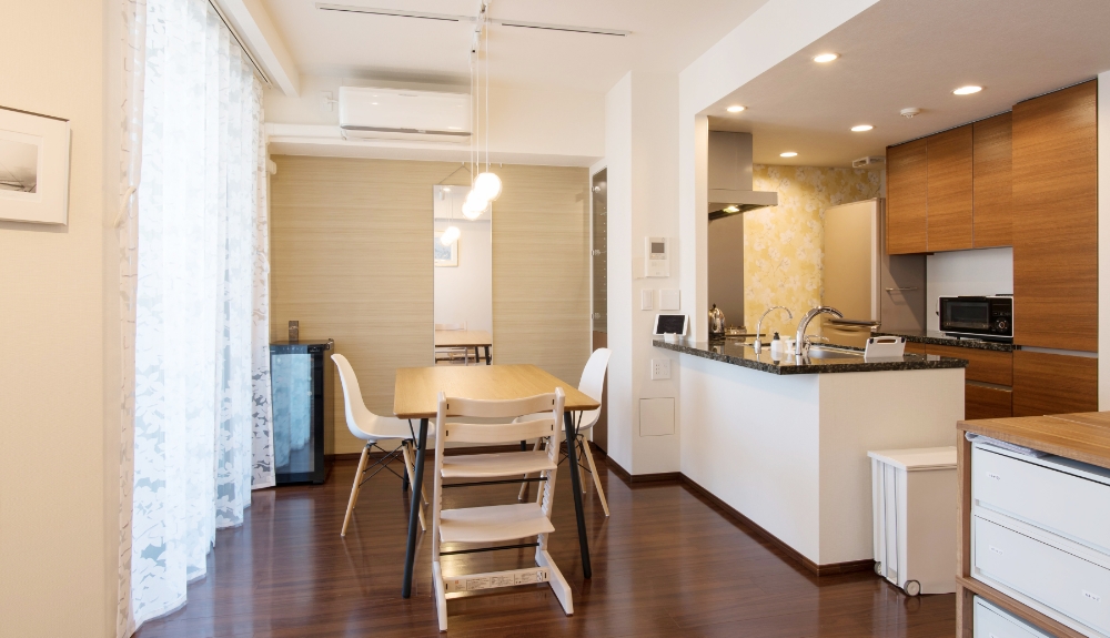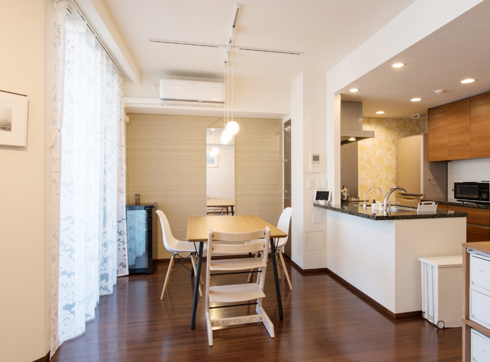 LDKは間取りを変えることなく、壁紙・照明だけを変更。ゾーニング、照明プランなどアイデアと工夫によって、コストを抑えながら納得のリフォームを実現する事例となりました。
