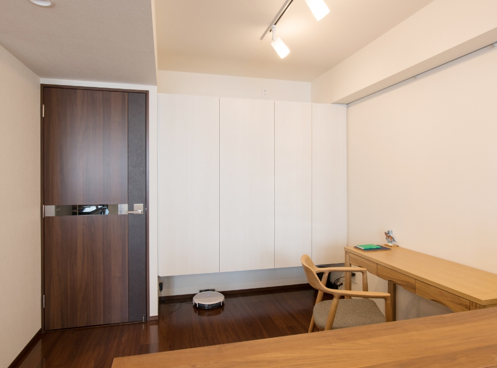 大きな面積を占める壁紙はインテリアイメージを決める重要な要素。壁紙を変えるだけでお部屋の印象は大きく変わります。今回は、明るい印象の部屋にするため、光を反射する効果がある白を基調にした壁紙を施主様が選択。部分的に壁紙の色と柄を変えることで空間にメリハリが生まれ、インテリア性を高めることに成功。明るく、おしゃれな空間になりました。