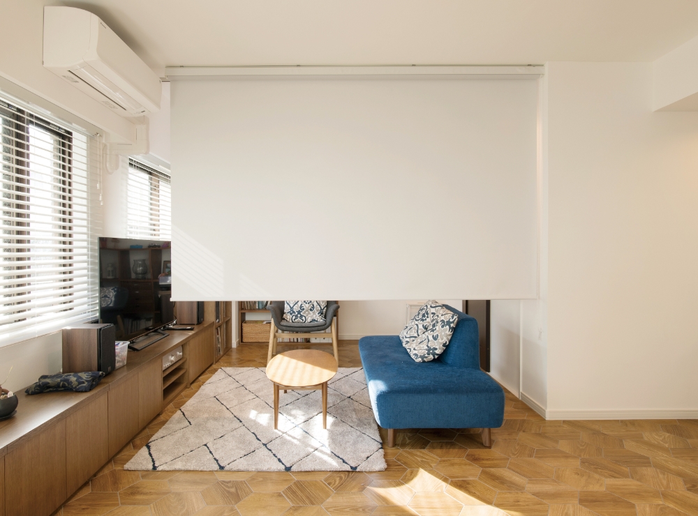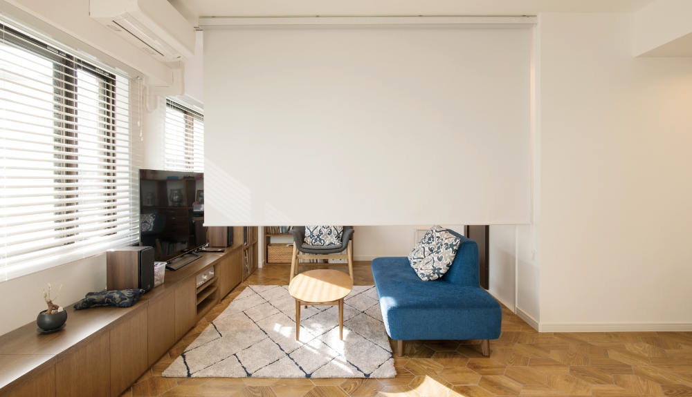 間仕切り用ロールスクリーン。来客時の宿泊用プライベートスペースにもなります。