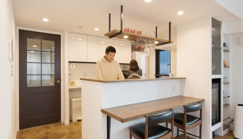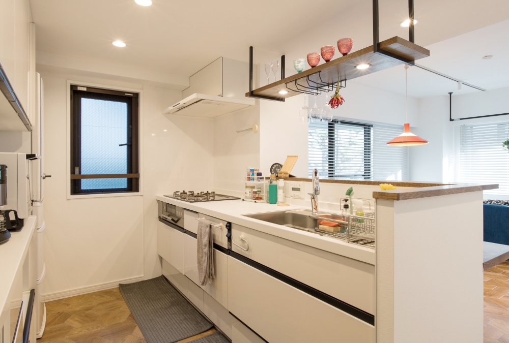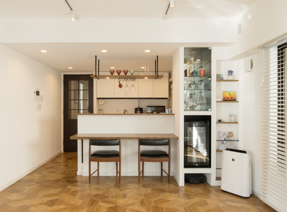 ご夫婦ふたりで料理を楽しめるよう通路幅を拡大。吊戸棚と壁を取り払い、開放感のあるキッチンになりました。ワインがお好きということでシンクの上にグラスハンガーを設置。ダイニング側にはカウンターを造作。お持ちのダイニングテーブルと高さを合わせています。お子様の学習スペースにもなっており、料理をしながら勉強をみれると好評です。カウンター横にグラス棚とワインセラーを造作。最下部にはルンバの基地。画面右端は、飾り棚とマガジンラックを設置しています。