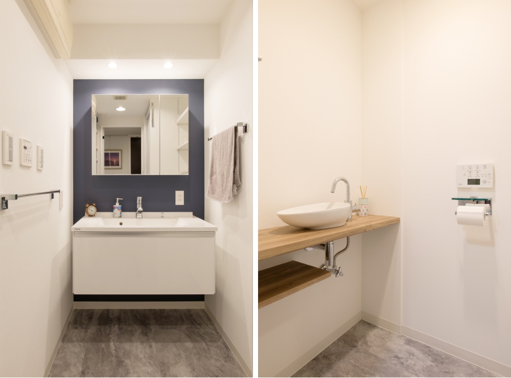 フロートタイプの洗面化粧台です。/トイレ内の手洗いカウンターは造作しました。
