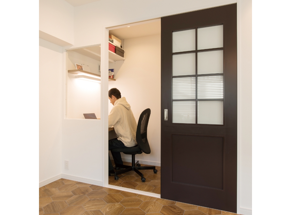 仕事に集中できる個室型ワークスペースをリビング内に設置。室内窓やガラス扉で閉塞感を感じないつくりに。個室になっているためリモート会議の時でも、家族の声や映り込みを気にする必要がありません。働き方が大きく変化した今、自宅にワークスペースを持つことは珍しいことではなくなってきています。K様邸は、ワークスペースをあえてリビングに作りました。そうすることで仕事をしながらも、壁に設けた室内窓やドアの小窓を通して子供たちの様子を見る事ができるようになっています。