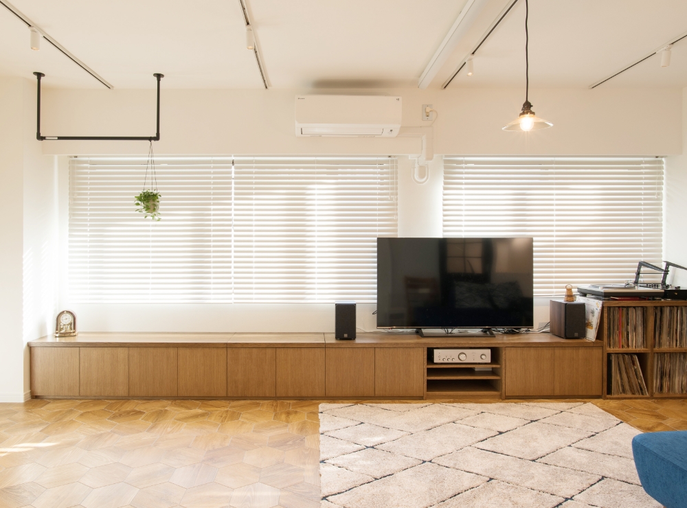 リビングにベンチ型の大型収納を造作。扉の中は全て収納。右端は、レコードが収納されたDJブース。ホームパーティのときにはベンチとしても使用できます。