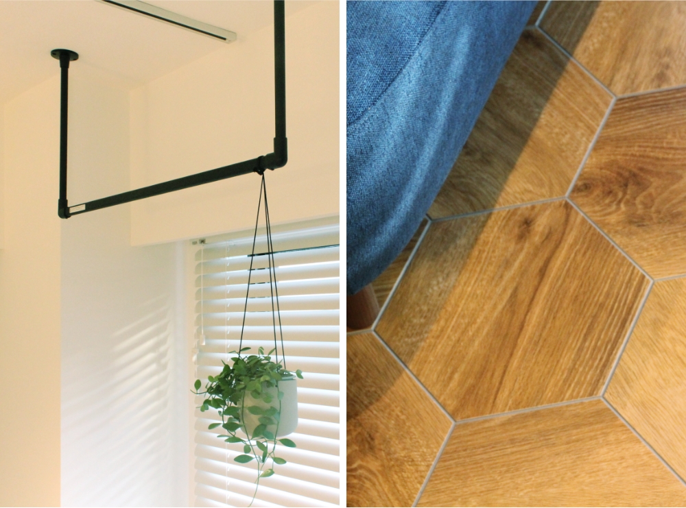 梅雨どきや花粉の季節の室内干しに便利なパイプハンガー。グリーンを飾るのもオススメです。リビングの床材はヘキサゴンタイル。少々コスト高ですが素敵なインテリアに。