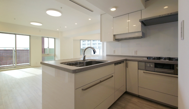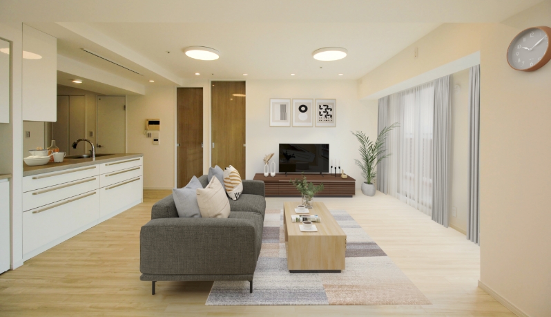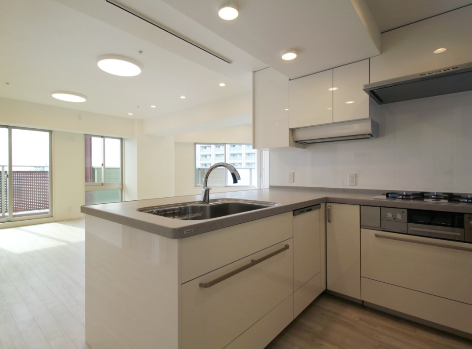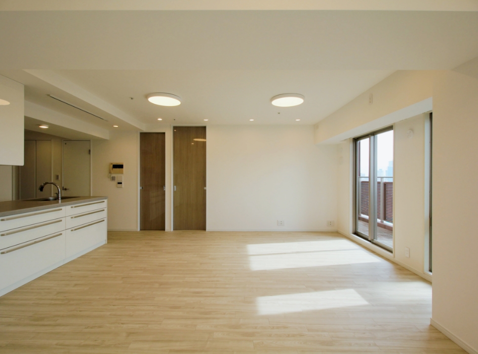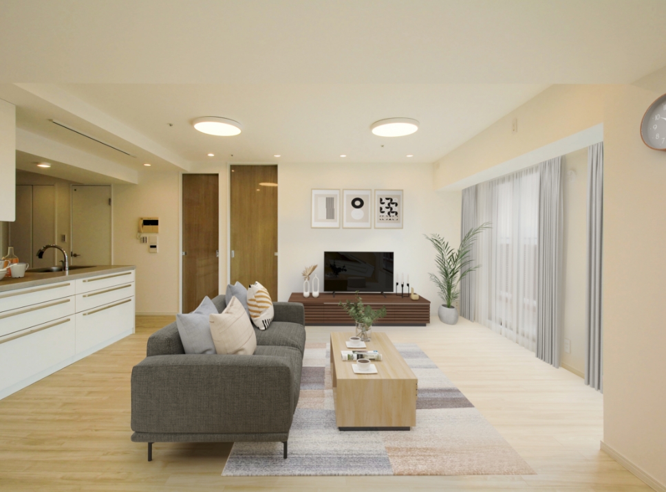 部屋をひとつ潰してリビングを拡大。L型対面キッチンを採用することで、キッチン正面の空間がオープンになり、開放的なLDKに生まれ変わりました。