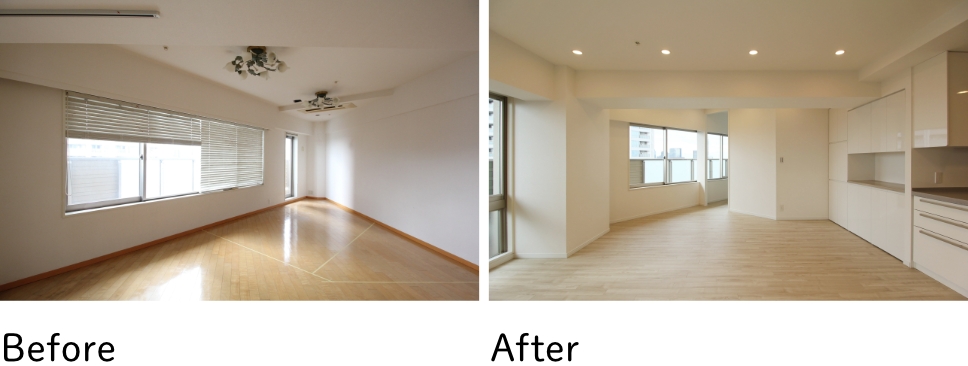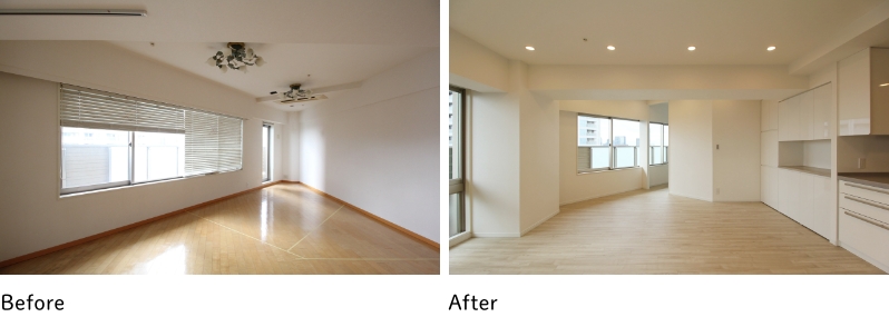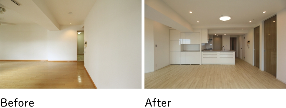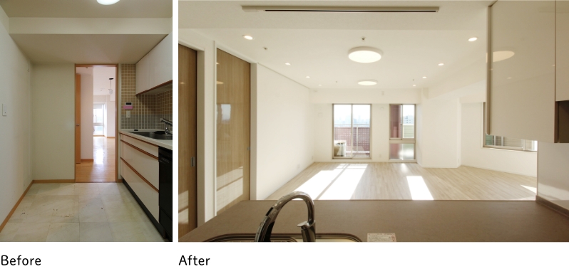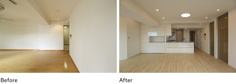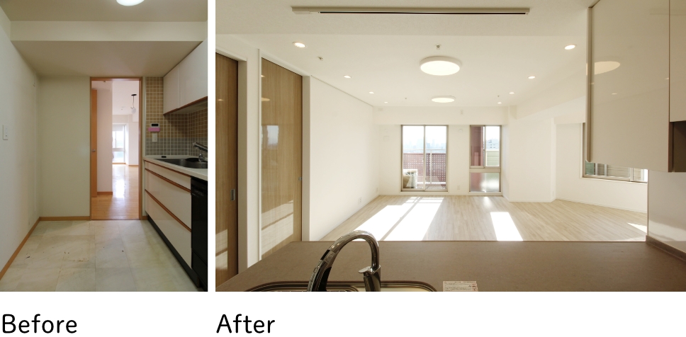 正面の壁を取り払い対面型のキッチンに変更。ビフォア写真右の壁側一部屋をつぶしてリビングを拡大。