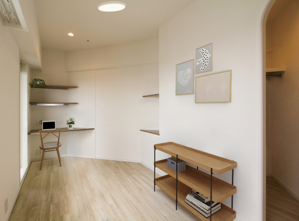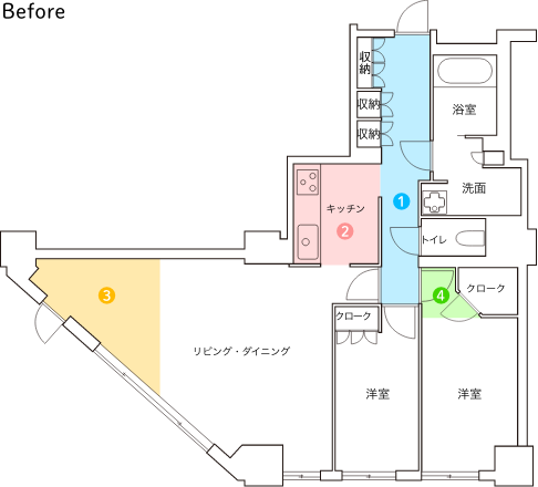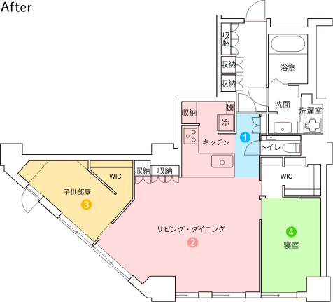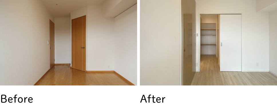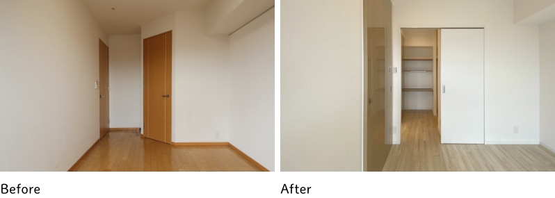 クローゼットの変形部分をウォークインクローゼットにし、収納量を拡大するとともに、部屋の形をスクエアに。