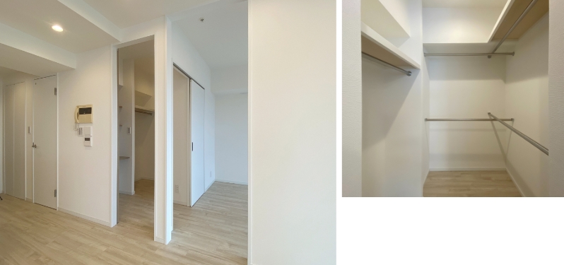 ウォークインクローゼットは2WAY。LDK側からもアプローチ可能。奥のハンガーパイプは上下 2 段。下段のパイプは取り外しできるため、家具も置けます。