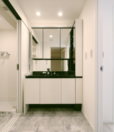 洗面化粧台は右側の壁面にも鏡と収納棚があり、収納量は十分。