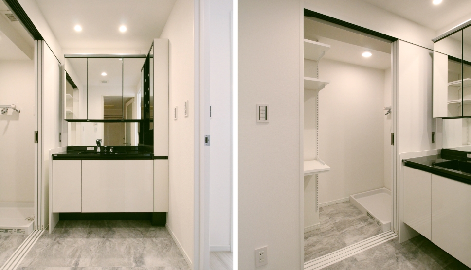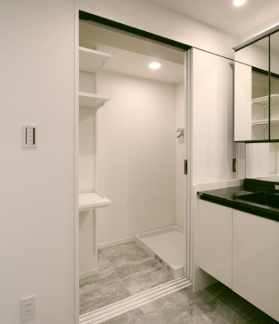 洗面化粧台は右側の壁面にも鏡と収納棚があり、収納量は十分。洗面化粧台の奥に洗濯室を増設。扉を締めれば洗濯機、洗濯物や脱衣かごなどを隠せます。