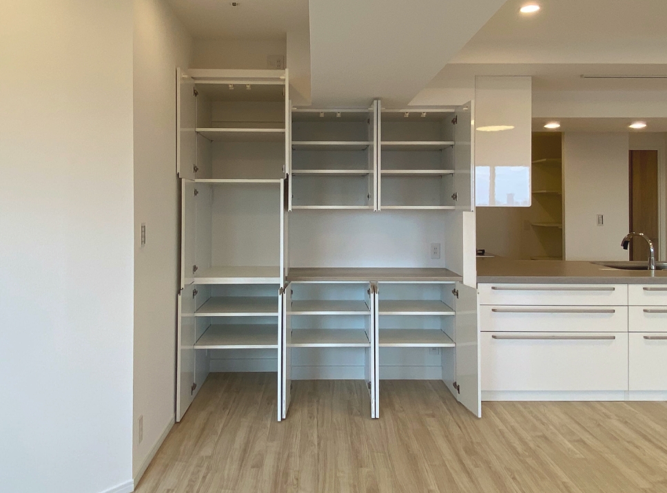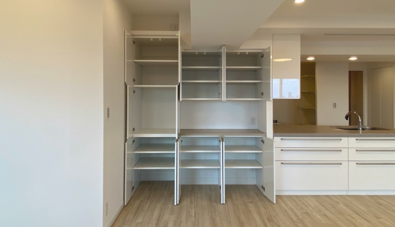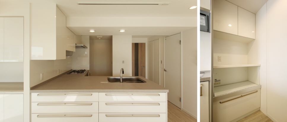 キッチン奥に冷蔵庫や家電、食器・食材などを収納する広めのスペースを用意。