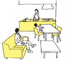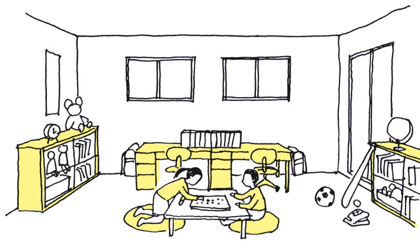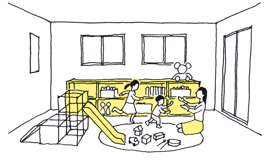 ⼦どもが幼児の間はお昼寝や遊び場に。児童になったら宿題をする場にも。⼦どもたちは遊びながら、学びながら、いつでもママやパパを⾝近に感じることができます。