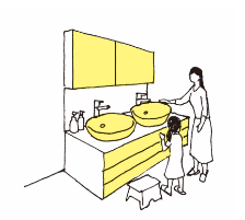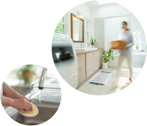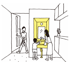 ママが⼀⼈で家事をする家庭と、「料理と掃除はママ、洗濯と⾷後の洗い物はパパ」というように役割分担をしている家庭とでは、家事をする時間帯や⼈の動きが異なります。ハグクムハウスは家事の仕⽅の詳細をお聞きし、そのご家庭に適した家事動線をご提案します。