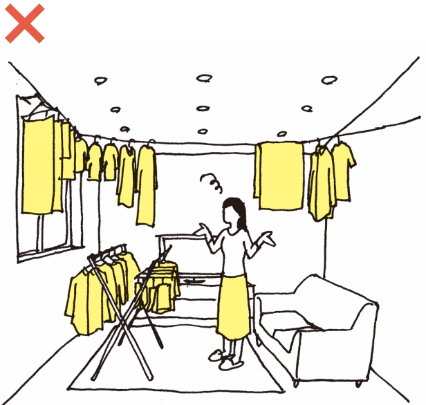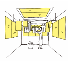 ⾬の⽇や花粉の季節など外に⼲せないときのため、室内に⼲す場所を設けておくこともポイント。洗濯物の⼲し場所は暮らし始めて困ったと思うことの代表例。室内に⼲し場がなくて、あちこちに洗濯物がぶら下がっていては鬱陶しいし、くつろげませんよね。