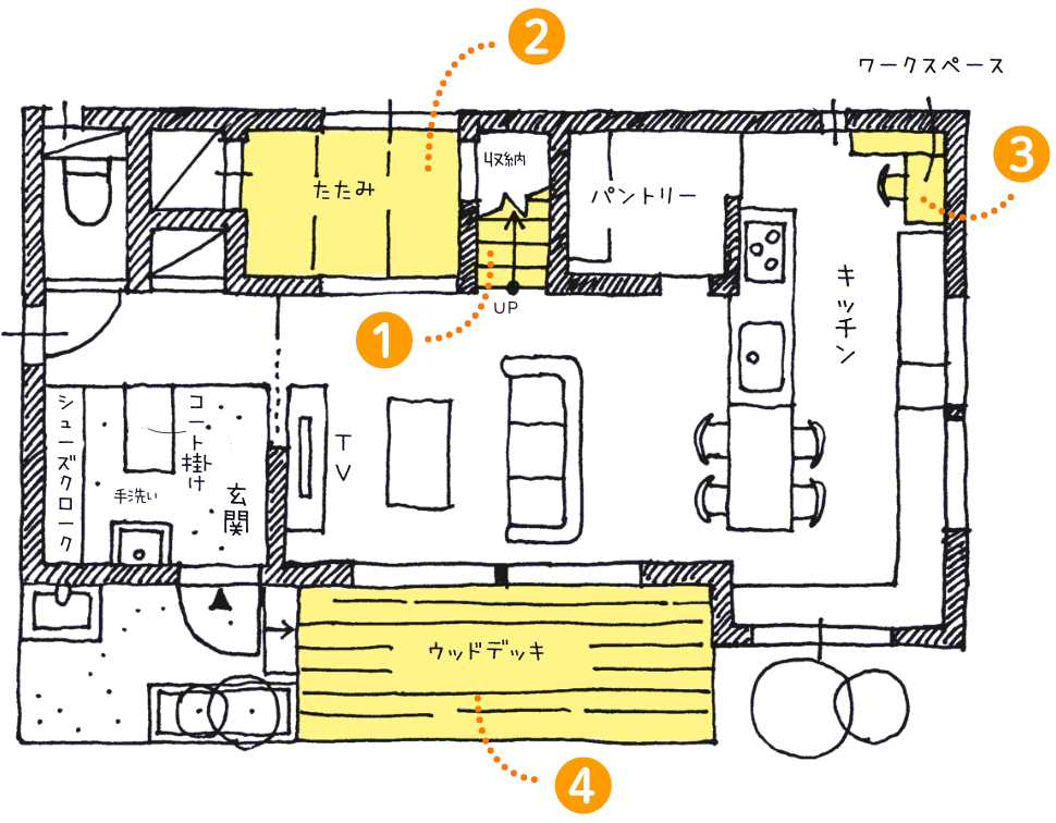 「⼦育ての家」の間取りは「部屋数の確保」よりも「家族が⼀緒に過ごせる空間づくり」を優先。ポイントのひとつは多⽬的で⼼地よいリビングの設計です。例えば、リビングに「おもちゃ遊びやお昼寝ができる畳コーナー」を設けるなど、「⼦どもと⼀緒の時間が⾃然と多くなるリビング」を提案します。