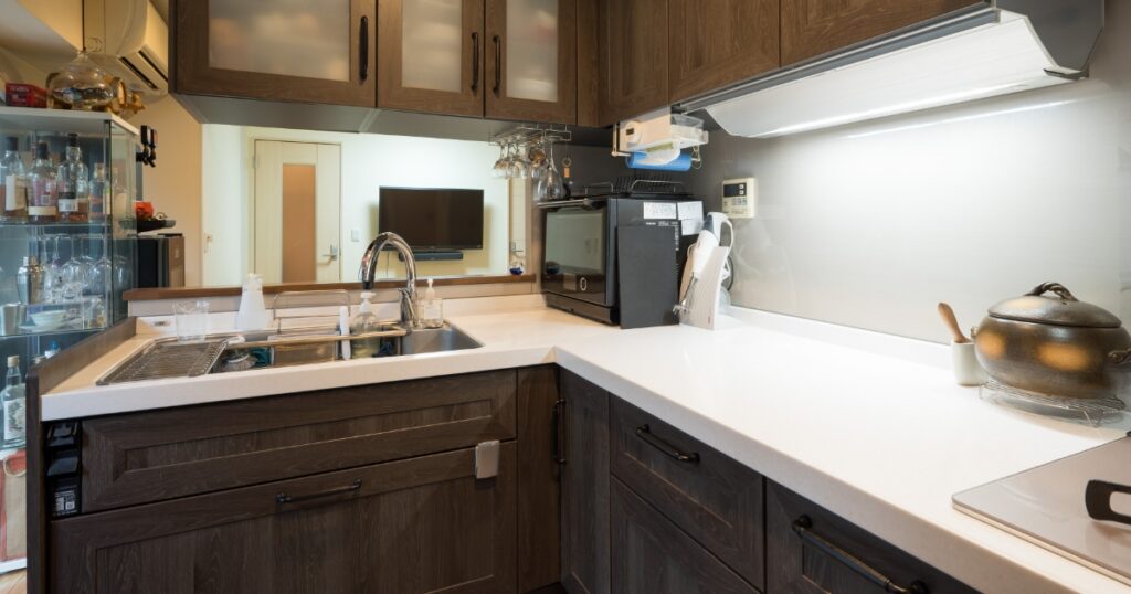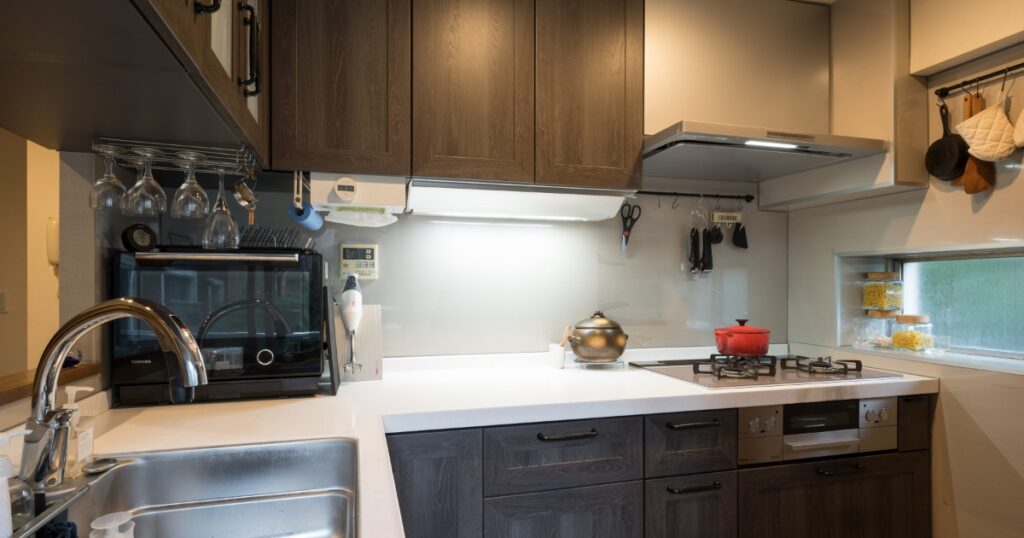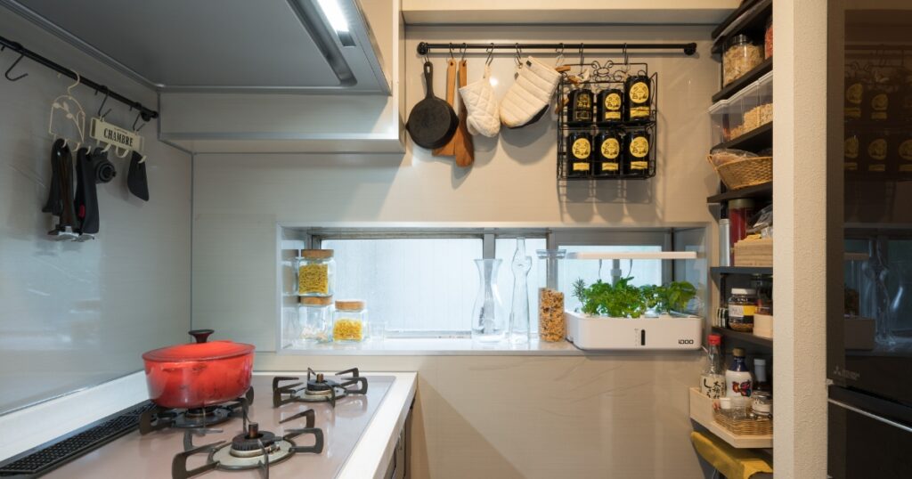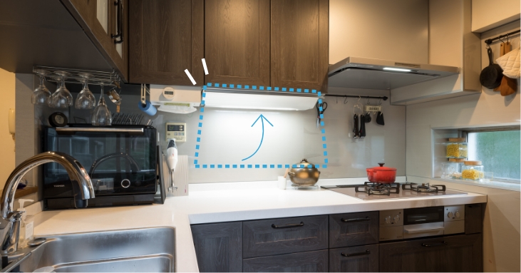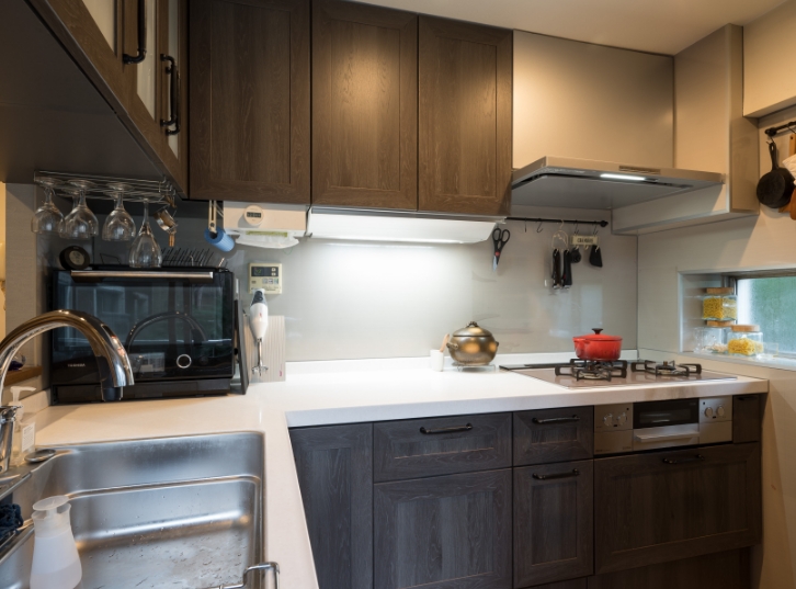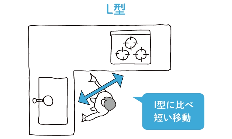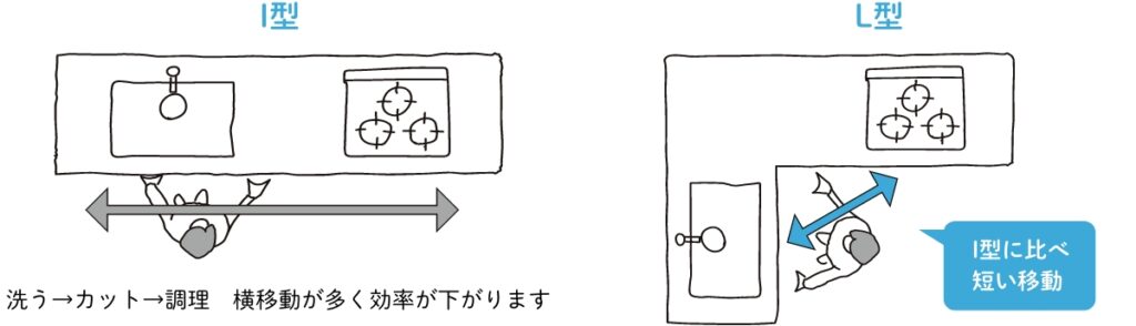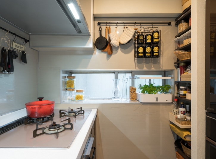 「作業しやすいキッチン」にしたいというご要望を受け、L型キッチンをご提案。L型キッチンのメリットは、料理や片づけの際に効率よく動けるレイアウトを作りやすいこと。「洗う」⇒「カットする」⇒「調理する」という動線がI型に比べて短くなります。作業スペースも広くとれるので作業効率がよく、二人でも使いやすいキッチンになりました。