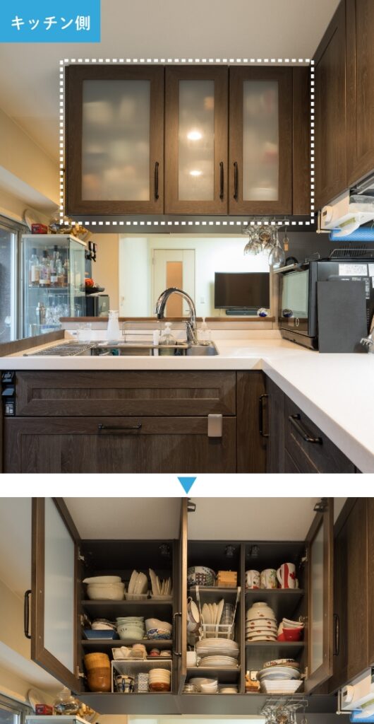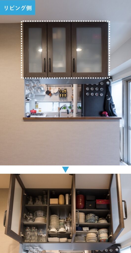 キッチン側には日常使いの食器類を収納。リビング側にはホームパーティ等で使用する食器類を収納。