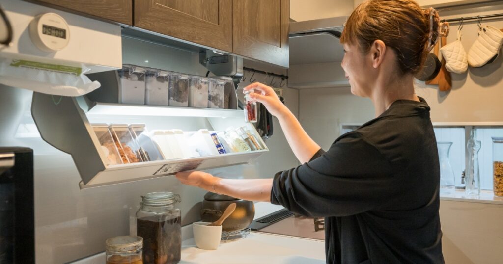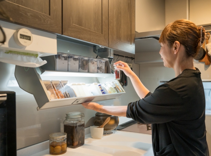 作業カウンター上部にクイックポケットを設置。調味料などを、目の前の使いやすい位置にまとめて収納できてとっても便利。