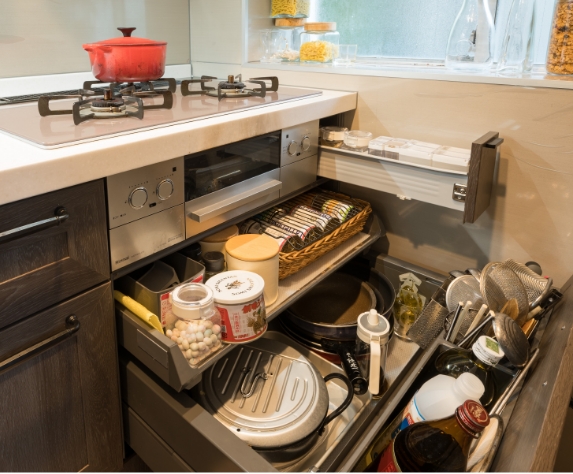 コンロ下も奥行と深さのある収納。鍋などの大物やおたまなどの調理器具。2段になった引き出し部分に缶詰類がすぐ取り出せるように配置。