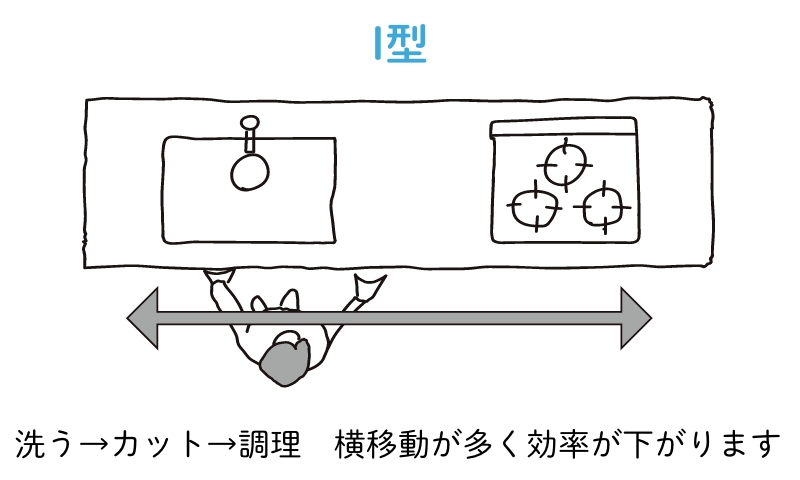 シンク側を対面式にすることで、リビング・ダイニングにいる家族や友人とのコミュニケーションをとれるように。コンロ側は壁付けにし、調理中の油はねを気にせず料理に集中できるように。間口が広く確保できない場合でも、奥行がある空間におすすめのレイアウトを提案しました