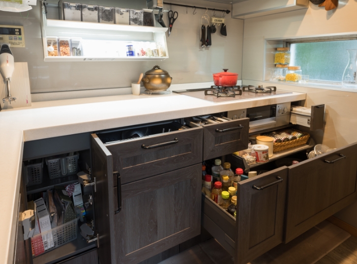 使い勝手のよいキッチンにするためには、使いやすいキッチン収納にすることが大切。コツはモノを使う場所にモノにあったサイズの収納を用意すること。よく使う調理器具と時々しか使わない調理器具、普段使いの食器類とホームパーティなど特別なシーンで活躍する食器類など。はじめに収納するモノの使用頻度や使用場所を詳細かつ具体的に想定し、それらが無理なくおさまる計画をたてました。