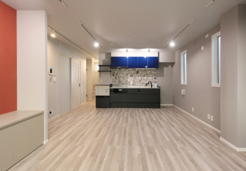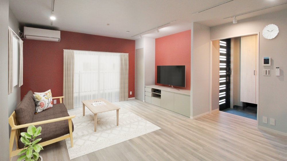 和室とリビングダイニングを隔てる壁と扉をとり外し、自然な光が届く広くて明るいLDKに。壁紙、床材を薄いグレーで統一し、施主様が好きな赤をアクセントカラーとして使用。明るくモダンな空間になりました。照明の位置を自由に変えられ、照明の数を増やすこともできるレール照明。暮らし方や家具の配置の変化に対応できる可変性のある照明計画になっています。